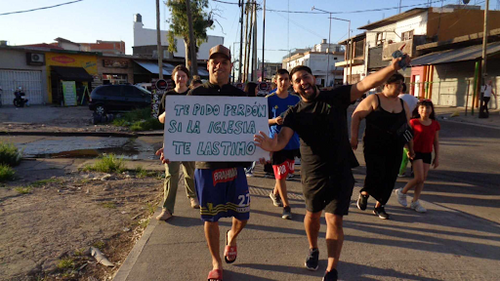 Street outreach with Amor Eterno church Sign reads,“I ask your forgiveness if the church has hurt you”